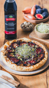 • Laisser cuire quelques minutes pour que le vinaigre balsamique réduise en caramel. Couvrir à l’aide d’une pâte feuilletée, en veillant à bien rabattre les bords de la pâte à l’intérieur pour emprisonner la garniture.